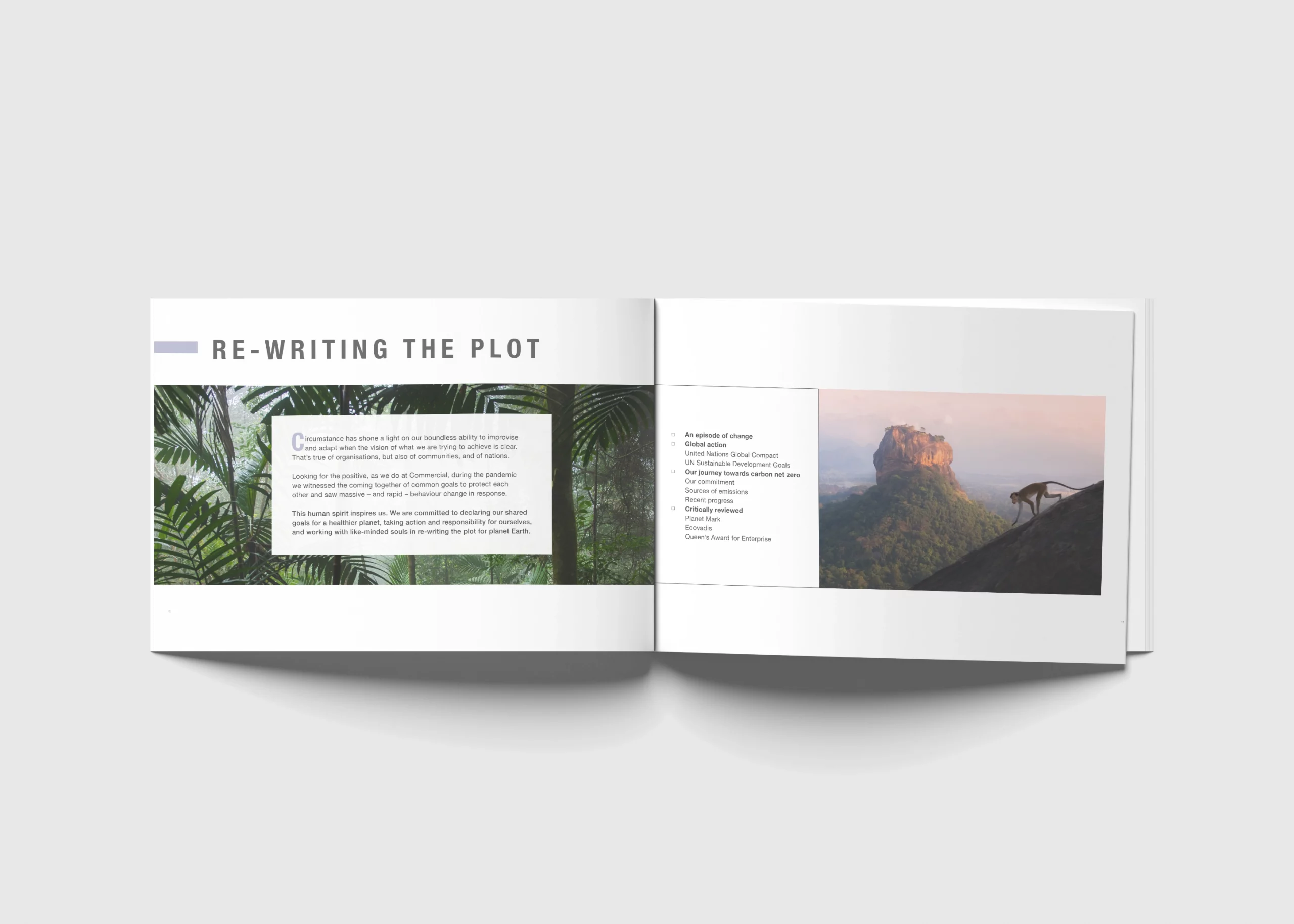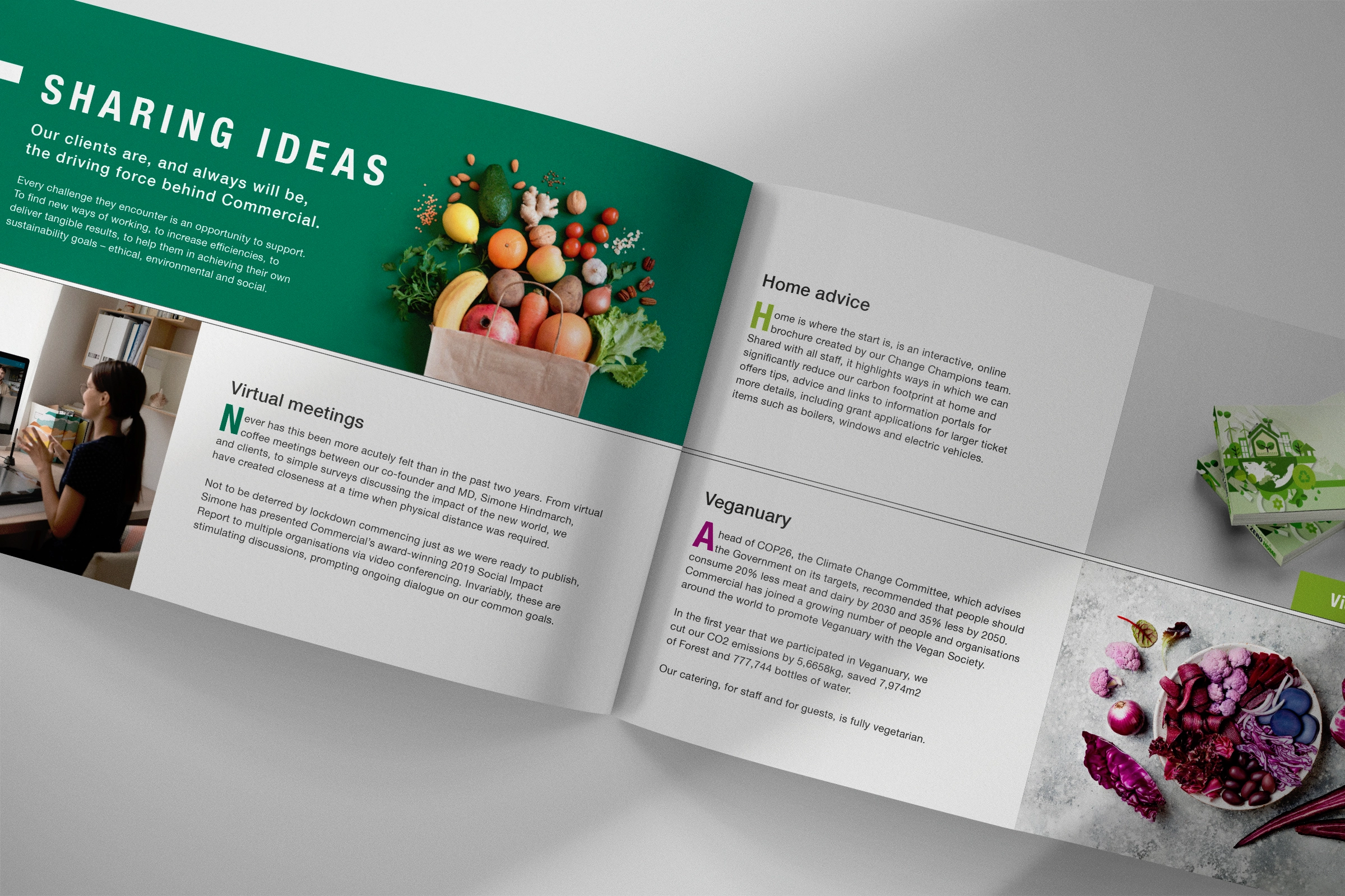 These spreads are taken from Commercial’s social impact report, a 92 page interactive eBook that brings the company’s sustainability journey to life. It charts progress up to 2021 and outlines future ambitions, all presented in a vibrant, engaging format. Rather than taking the form of a traditional report, it features dynamic layouts and animated, interactive elements designed to captivate and inform the reader.